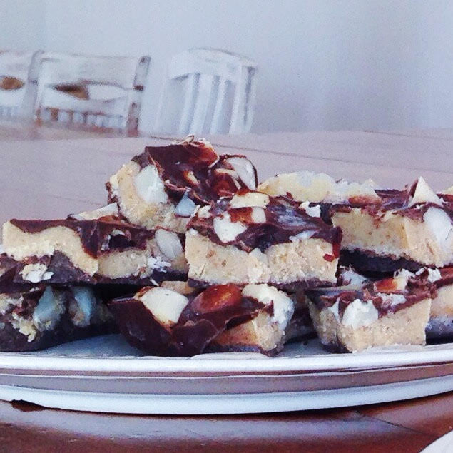 - Blend together pour half into a lined dish and place this base in the freezer to set. Keep other half aside for topping (keep melted by placing the bowl it's in in warm water)