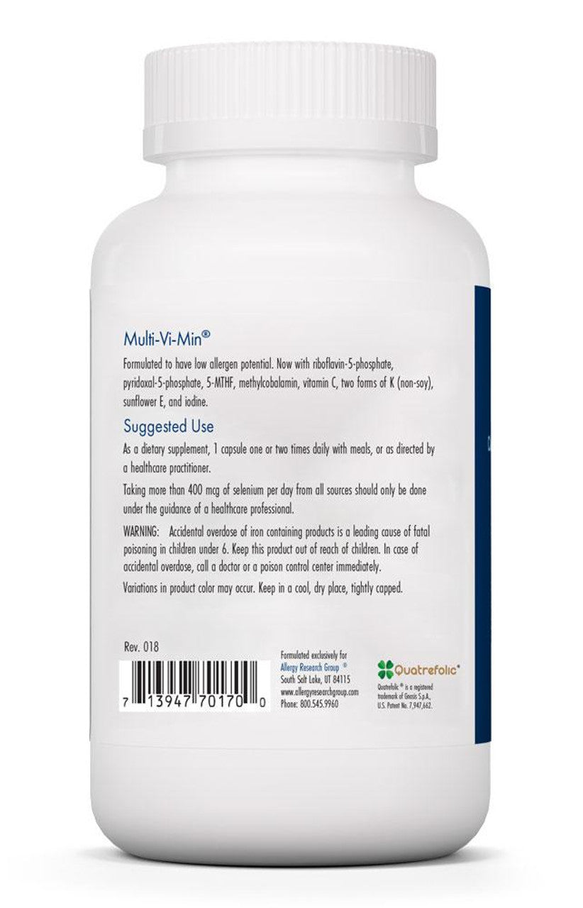 Multi-Vi-Min® is formulated to have low allergen potential. Now with riboflavin-5-phosphate, pyridoxal-5-phosphate, 5-MTHF, methylcobalamin, vitamin C, two forms of K (non-soy), sunflower E, and iodine.