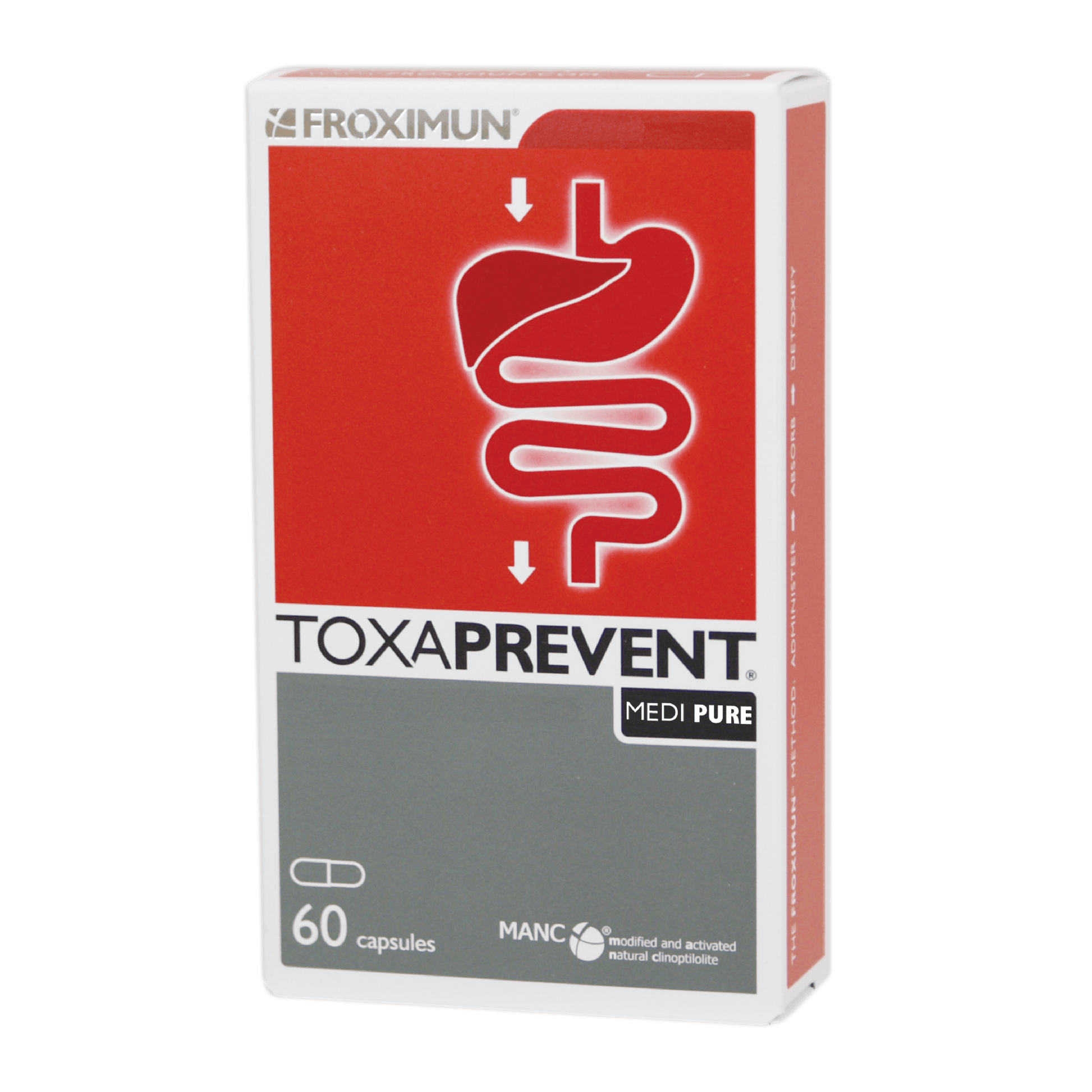 TOXAPREVENT® MEDI PURE comes in an acid resistant vegetable coated capsule, designed specifically to bypass the stomach and deliver MANC® directly to the small and large intestinal tracts.