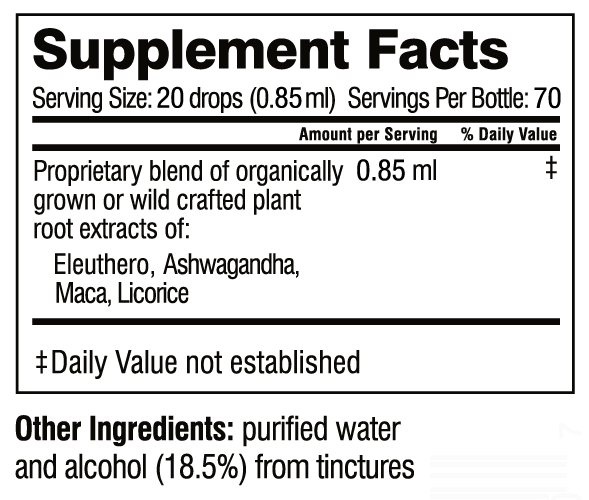 Herbal Adrenal Support Formula® is a tincture blend of four raw, organically grown, adaptogenic herbs synergistically formulated to enhance cortisol activity and safely promote balanced function in the hypothalamic-pituitary-adrenal (HPA) axis stress-response system. The high levels of active constituents in these specially selected and prepared full-spectrum herbs support the adrenal glands without over stimulation, help sustain stable hormone and serum glucose levels, and modulate other stress reactions.