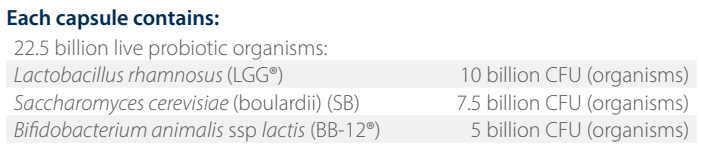 Contains live, original and clinically researched probiotic forms. LGG®, SB and BB-12® are three of the world’s most extensively researched probiotics with a range of clinically demonstrated health benefits. Factors that can influence probiotic activity include its genetic profile, manufacture (from culture to production) and storage. Live SB synthesises and secretes polyamines in order to exert its beneficial effects on the gastrointestinal mucosa, and inhibits pathogens. Ultra Flora Intensive Care guarantees live SB CFU (colony forming units) at the label dose until expiry for clinical efficacy. LGG® is a genetically unique probiotic grown to a specific culturing and manufacturing process in order to provide reproducible and consistent clinical benefits in line with its wide body of research. Probiotics are genetically unique at a strain level and health benefits are not transferrable between strains (even within species).