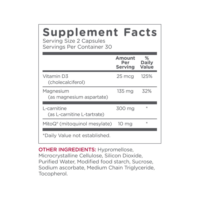 In addition to a full daily recommended dose of our breakthrough MitoQ 5mg formula, MitoQ Heart also includes effective levels of heart health ingredients Vitamin D3, Magnesium and L-Carnitine.