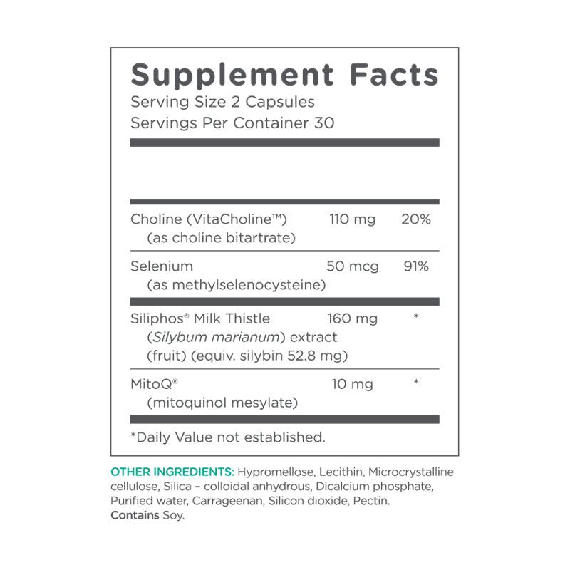 MitoQ® (Mitoquinol mesylate), Siliphos® Milk Thistle, Vitacholine™, Selenium,