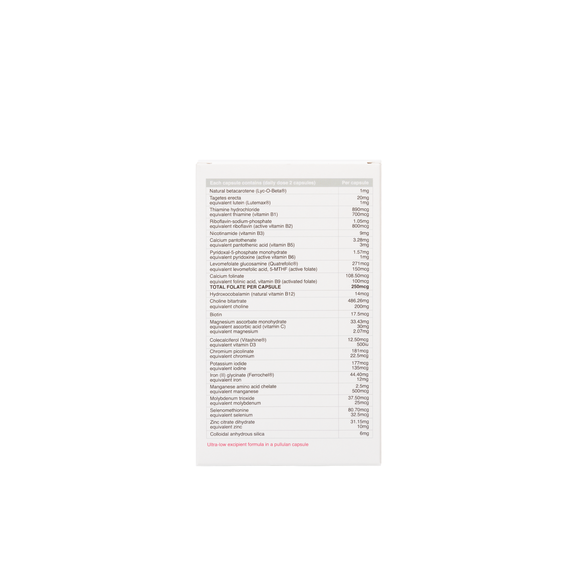 Just as important as what is in the formula, is what isn't. We have recently reformulated our preconception and prenatal vitamins with the aim to be the cleanest prenatal vitamins in the world with only two added excipients, calcium hydrogen phosphate and medium chain triglycerides in a pullulan capsule. This ensures our products are suitable for most people, in particular, those with pine allergies (commonly found in asthmatics) who may react to microcrystalline cellulose and Vcaps.