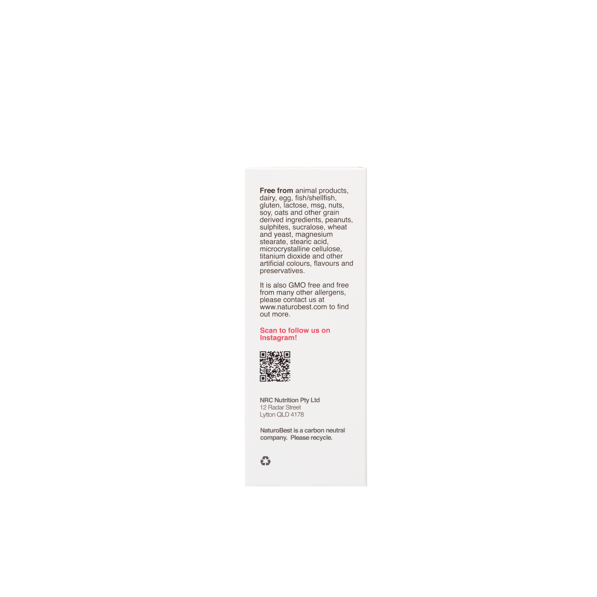 Each pack contains 60 capsules, intended to last 30 days when taken twice daily. The formula is free from genetically modified organisms (GMOs), as well as animal products, dairy, egg, fish/shellfish, soy, gluten, lactose, MSG, nuts, oats and grain derived ingredients, peanuts, sulphites, sucralose, wheat, yeast, magnesium stearate, stearic acid, microcrystalline cellulose, pine, titanium dioxide and artificial colours, flavours, and preservatives.