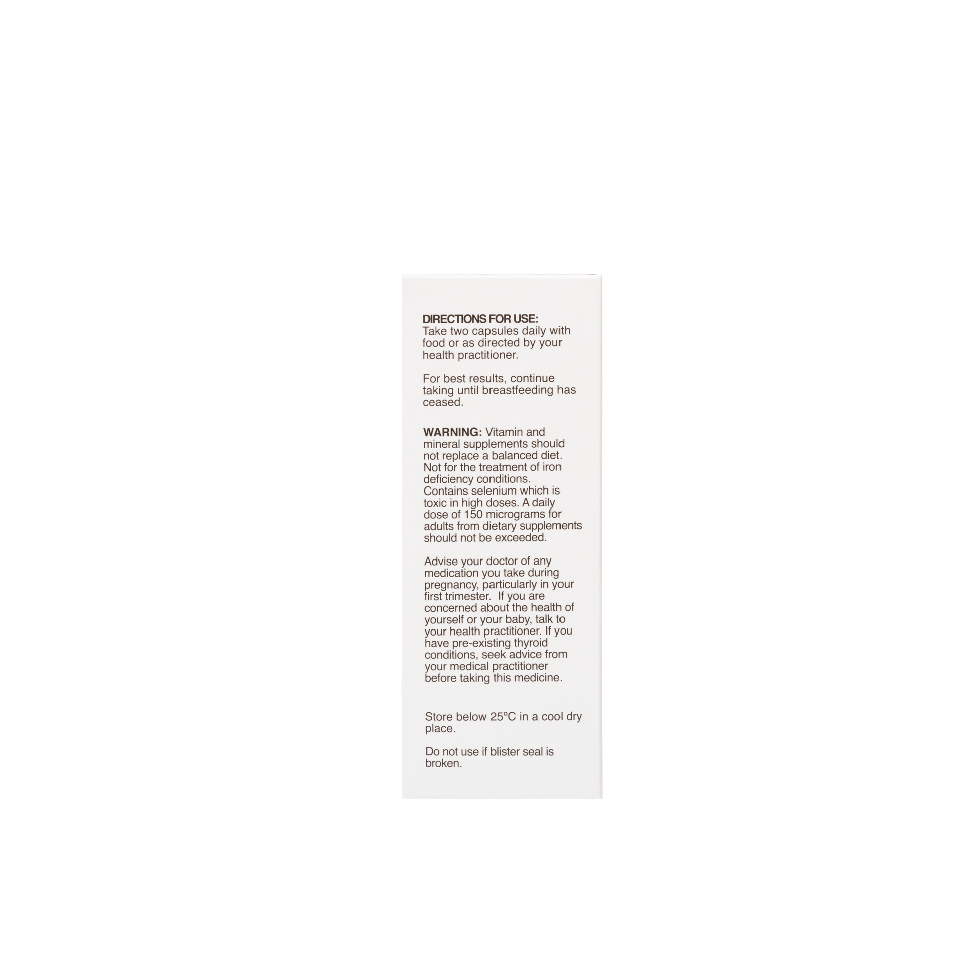 - Contains selenium which is toxic in high doses. A daily dose of 150 micrograms for adults of selenium from dietary supplements should not be exceeded.