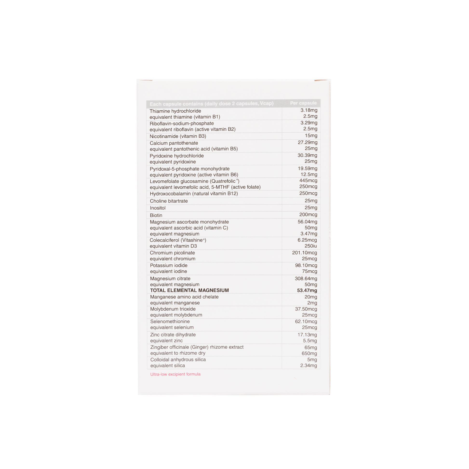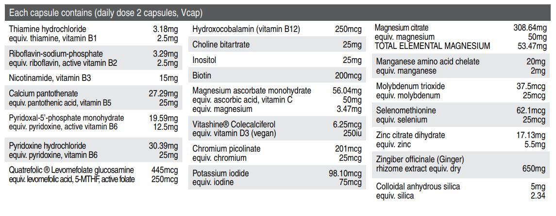 Provides active forms of vitamins B2, B6, B12 and folate and is free from copper. This is an ultra-low excipient formula.