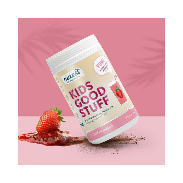 NuZest Kids Good Stuff Wild Strawberry provides complete daily nutritional support. Made from real fruit and veg, with 24 vitamins and mineral, 8g of protein and 3 billion CFU probiotics per serve.