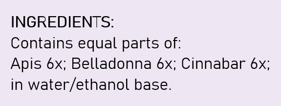 INGREDIENTS: Contains equal parts of: Apis 6x; Belladonna 6x; Cinnabar 6x; in water/ethanol base.